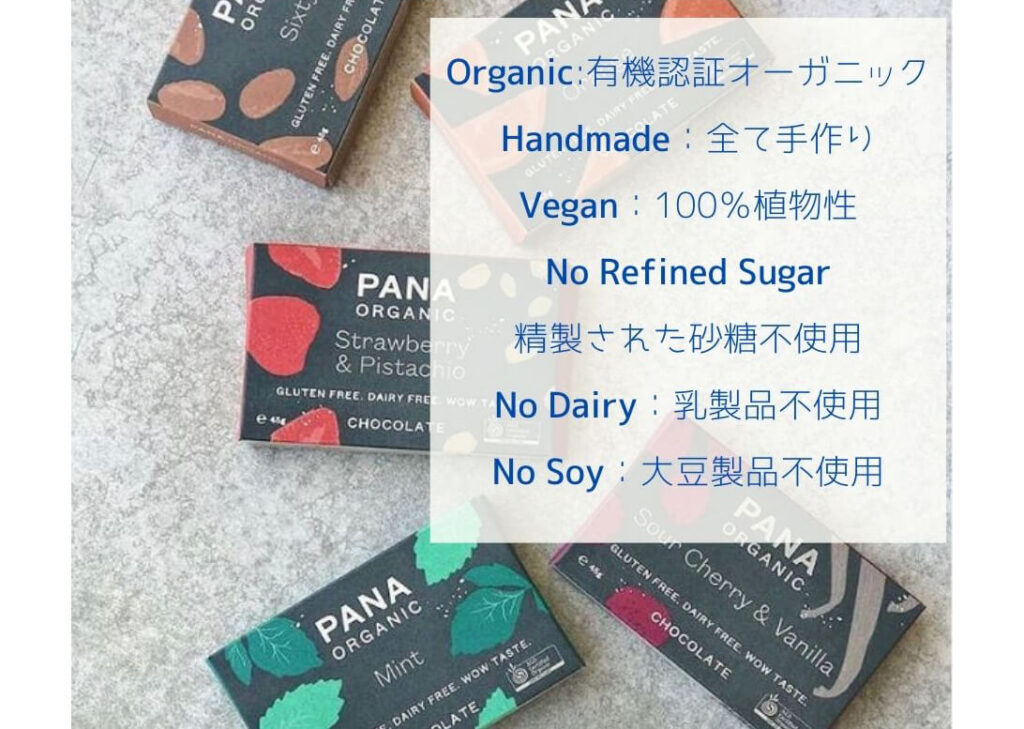 独特の柔らかい食感と濃厚なカカオ感が特徴のパナオーガニックのチョコレートは、100%ヴィーガン(植物性)でグルテンフリー。精製された砂糖も一切使用せず、甘みは天然のアガベネクターとココナッツネクターを使用しています。すべてオーストラリア認定オーガニック、ACO(Australia Certified Organic)の厳しい基準を満たしており、もちろん日本でも有機JAS認証を取得しています。パナ社は毎年豪州で植林活動を行なっており、今まで累計50,000本以上の木を植えています。 身体にも、社会にも、地球環境にも優しいチョコレートです。