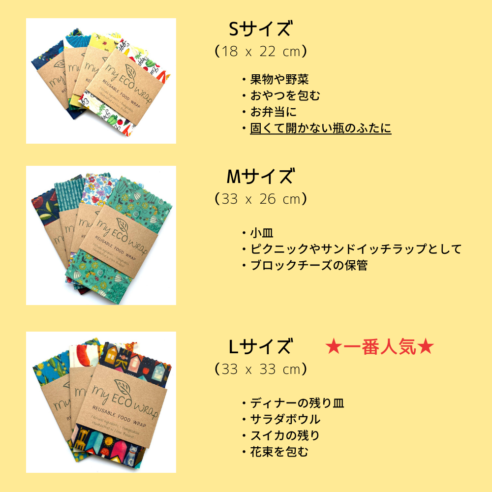 Sサイズは半分にカットした野菜や果物に、Mサイズはお弁当やサンドイッチラップとして、Lサイズはお皿やサラダボウルを包んだり、花束に利用したりもできます。花束を、再利用可能なエコラップで包んで誰かにプレゼントなんて素敵ですよね♪