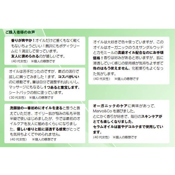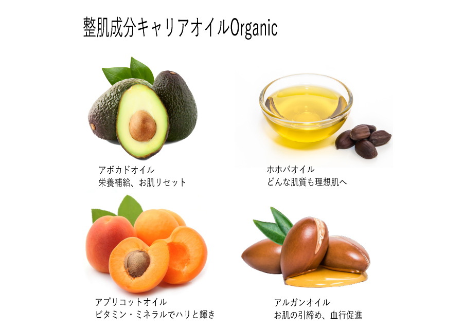 ホホバ種子油、アルガニアスピノサ核油、アンズ核油、アボカド油、ビャクダン油、カミツレ油