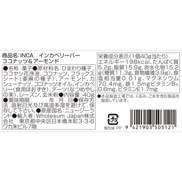 ひまわり種子、ココヤシ樹液、レーズン、ココナッツ、 フラックスシード(亜麻の実)、アーモンド、インカベリー(食用ほおずき)、デーツ(ナツメヤシの実)、カシューナッツ、ココナッツオイル、玄米粉